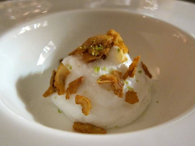 Lime posset, spiced bread {dehydrated and fresh}, mango, meringue