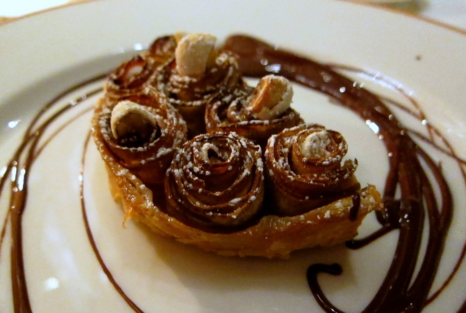 Pear tart, almonds, millefeuille and chocolate sauce