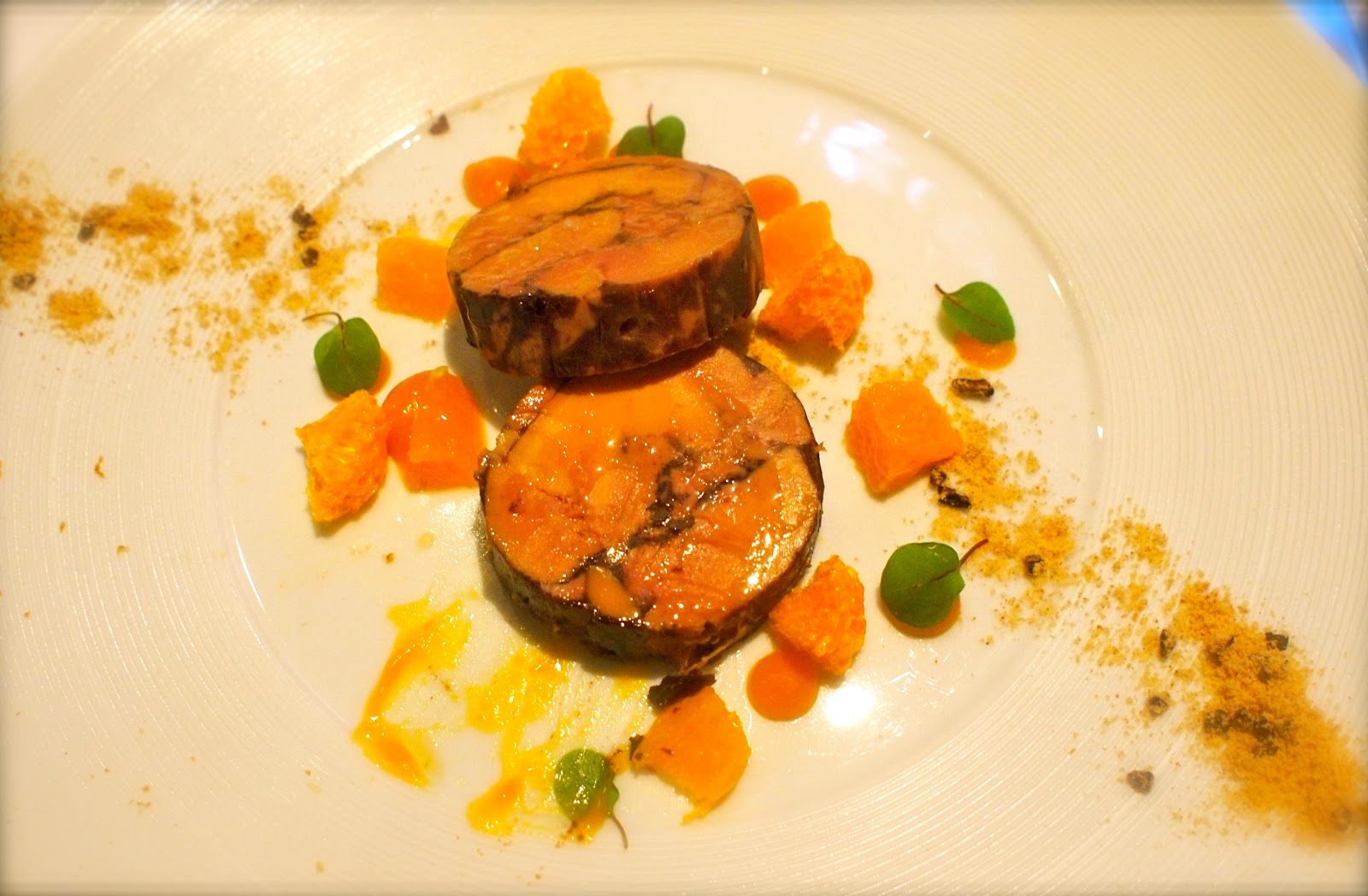 | Torchon of foie gras, orange puree, coca |